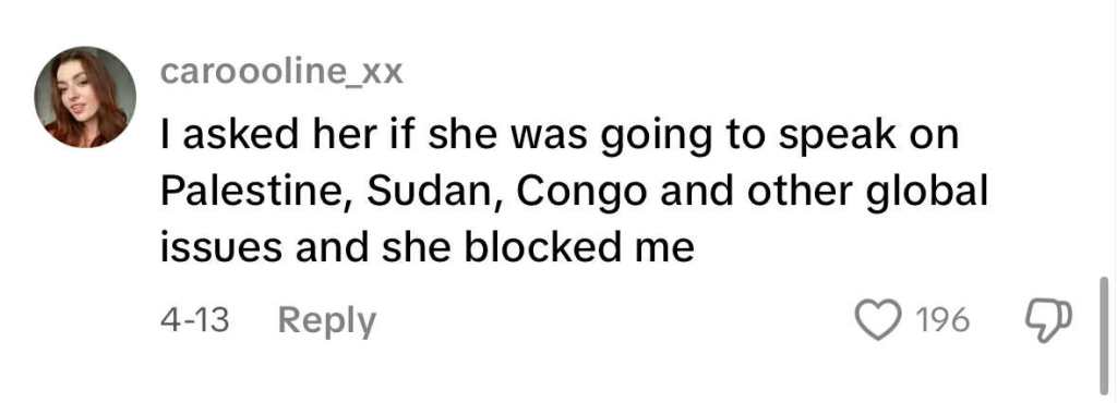 Her followers are questioning why she stays silent, why she’s platforming a glamorised America, and those comments are ignored. Yet comments complimenting her hair, thrift finds, or selfies? Always answered with praise. To me? The selective engagement reveals where her priorities lie. I’d also like to add, as I wrote this paragraph, she actually limited the comments on all her posts, so she can’t play ignorance here. She has seen the comments, she just chooses not to address them.