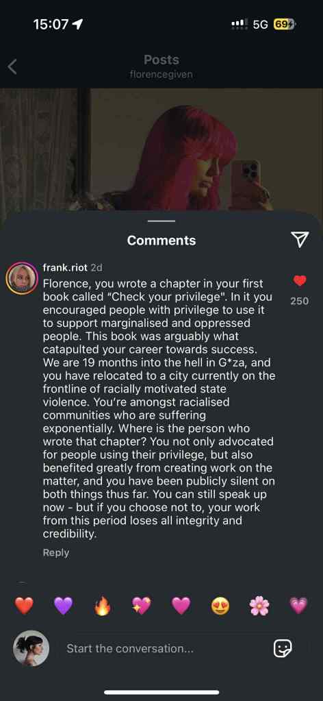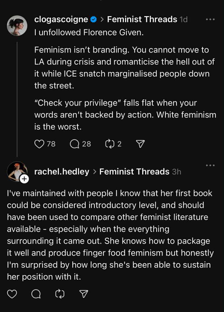 You might say it’s not their responsibility or give them a free pass because you like their “work”, but to me, It’s important to hold public figures accountable, especially the ones who claim to speak for marginalised groups. Florence has profited from the language and aesthetics of feminist activism yet fails to act when it really counts.