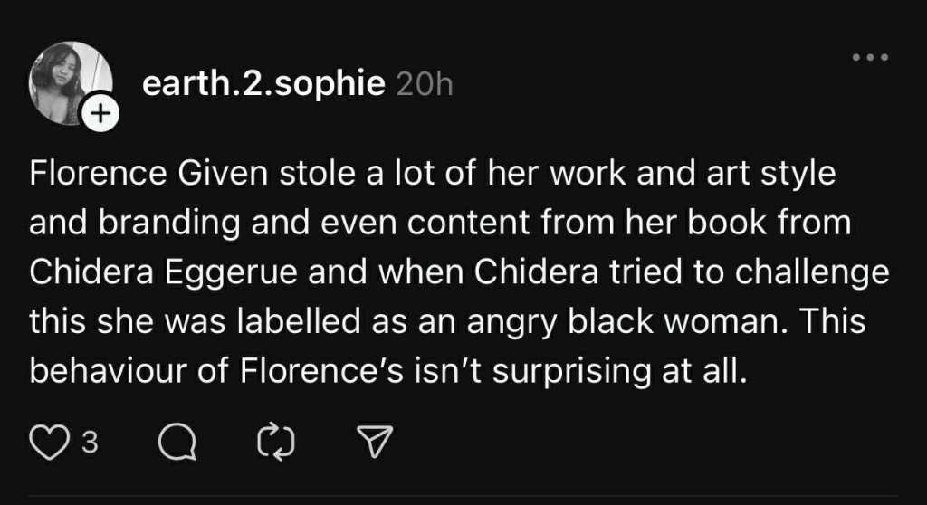 She portrays herself as this “beacon of morality” but has always centred her content around issues that affect white, cisgender women, conveniently skimming over intersectional struggles. Her feminism rarely acknowledges the lived experiences of women of colour or working-class voices. Now, I’m not saying she has NEVER spoken on these issues, but it’s been so infrequent or surface-level that I genuinely can’t recall a single piece of her work that meaningfully engages with them. Her brand of feminism isolates those who aren’t white, cis, or middle/upper class. She isn’t intersectional and including illustrations of black women doesn’t change that. Which, may I add, she has been accused of copying from black creator and writer, Chidera Eggerue