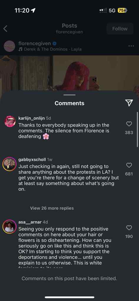 Florence has a HUGE platform but has remained silent during vital political moments surrounding women’s rights including abortion bans/restrictions, trans rights rollbacks, and more. Her selective engagement undermines everything her brand pretends to amplify. And as of this moment, she is actively ignoring the ICE raids happening on her doorstep.